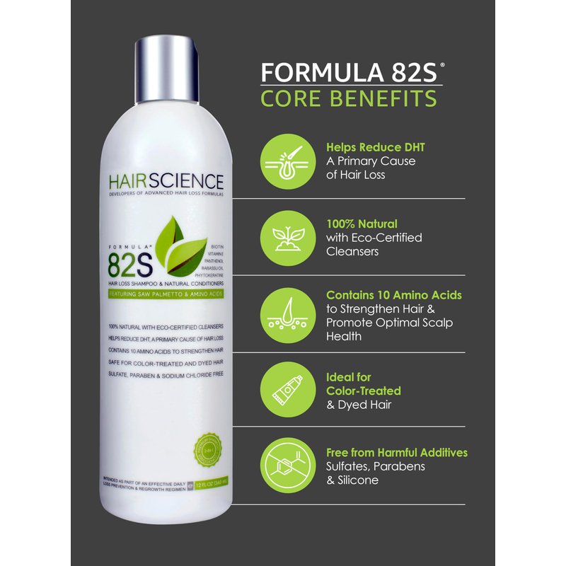 Each bottle of Formula 82S contains the active ingredient Saw Palmetto. Standard size, 12 oz bottle, typically last users 8-10 weeks. Note: For most hair types, a separate conditioner is not needed.