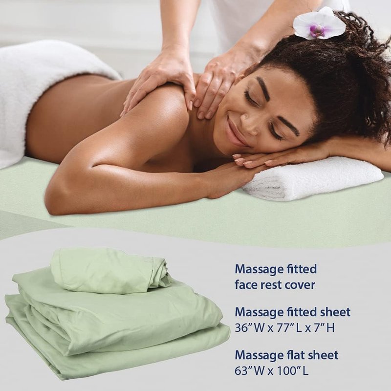 - 3-Piece Massage Sheet Set: Set includes massage flat sheet 63" W x 100" L, massage fitted sheet 36” W x 77” L x 7” H, and massage fitted face rest