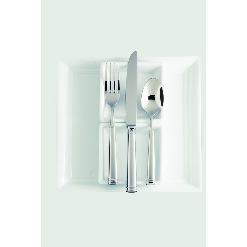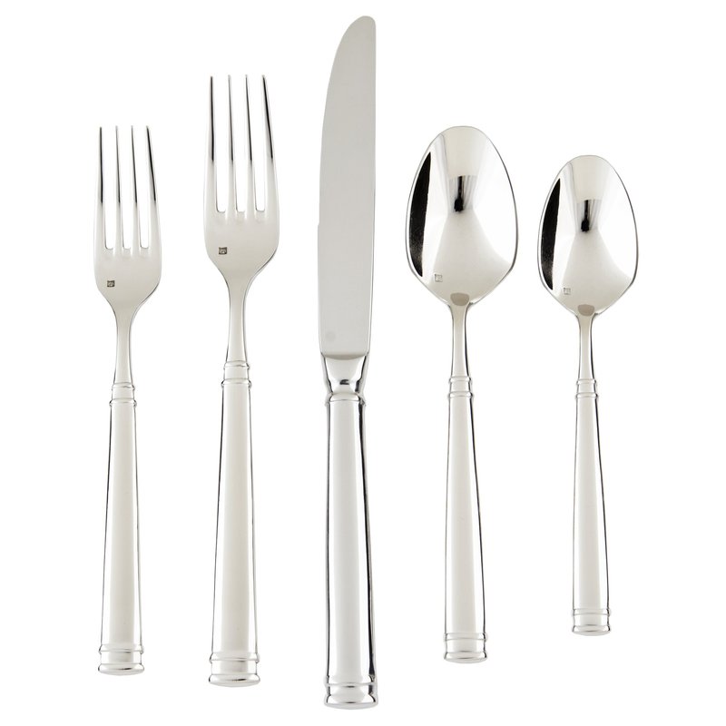 - 5 piece set includes: table fork, salad/dessert fork, table knife, dessert/soup spoon, coffee/ tea spoon; features heft, weight and balance in hand