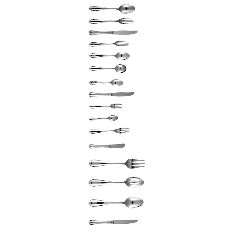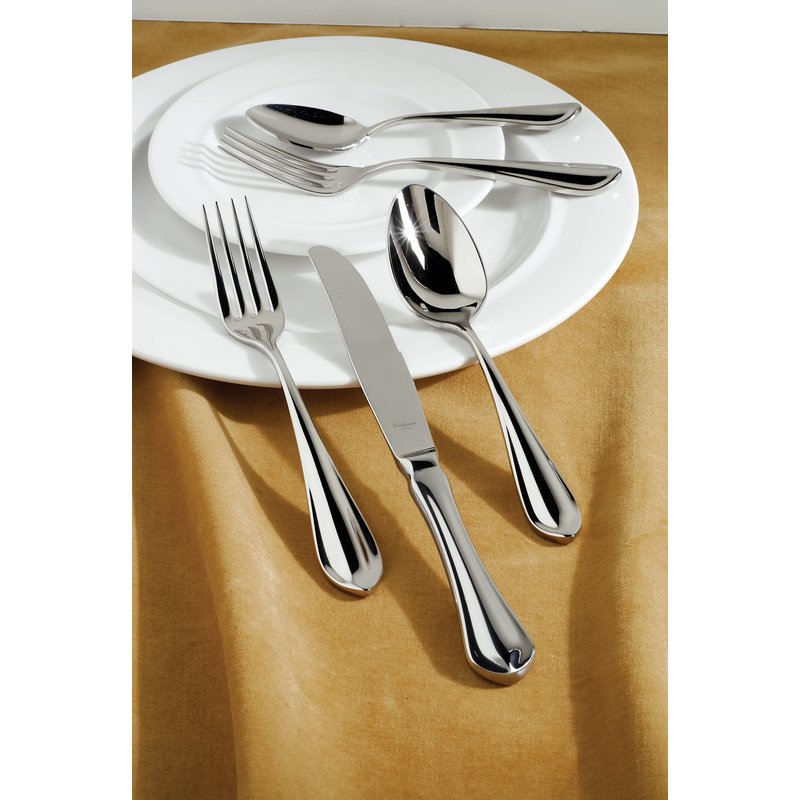 - 5 piece set includes: table fork, salad/dessert fork, table knife, dessert/soup spoon, coffee/tea spoon; features heft, weight and balance in hand
