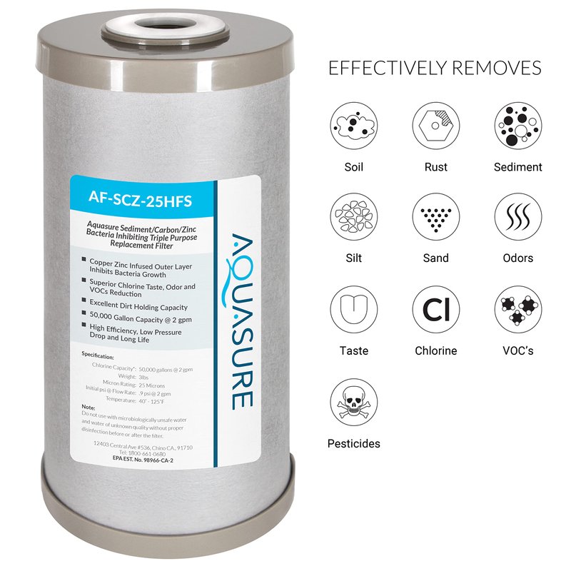 The Aquasure AF-SCZ-25HFS Sediment/Carbon/Zinc Bacteria inhibiting Triple Purpose Filter provides a unique design that combines the sediment outer layer infused with copper-zinc to help remove the majority of suspended particles in the water and also inhibits bacteria growth. Its inner carbon core absorbs chlorine, taste, odors, and chemicals. Making it one of the most versatile water filters for both residential and small industrial applications. *This replacement filter only works with AS-FS-25SCZ it will not fit any other Fortitude 10" housing. For standard 10" Fortitude housing, please purchase AF-SCP-4510 for replacement filters.