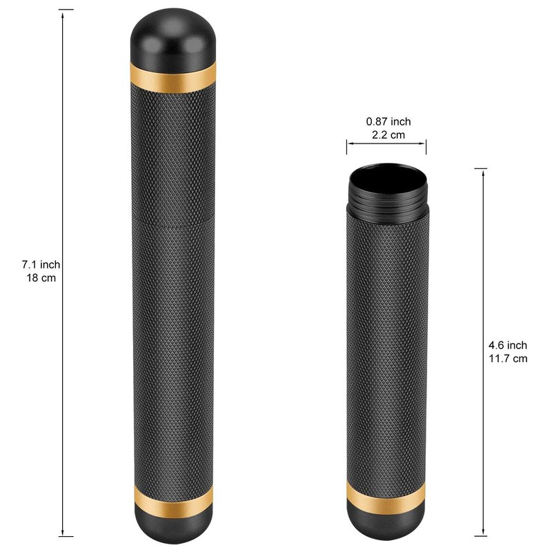Fortune Nexus AirTight Smell Proof Cigar Case Tube Is made of metal. It's strong and sturdy to protect the cigar from damage. The tube is in black colorway. There is a rounded golden band near the top and bottom on the tubes which makes it look more appealing. It can be open by twisting to the left, and close it by twisting to the right. Airtight seal, smell proof and waterproof ensures cigar is in its best condition.. The cigar tube can hold one cigar up to 52 ring gauge and 7" long. The tube measures 0.87" in diameters and 7.1 " long in length