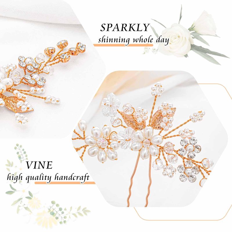 - 💐Materials: Crafted from high-quality materials, these hair pins are composed of dazzling rhinestones, exquisite pearls, and durable alloy. The Rose Gold Rhinestone Vine Hair pins are meticulously assembled with alloy wires that connect the rhinestones and pearls, ensuring both durability and a luxurious appearance.