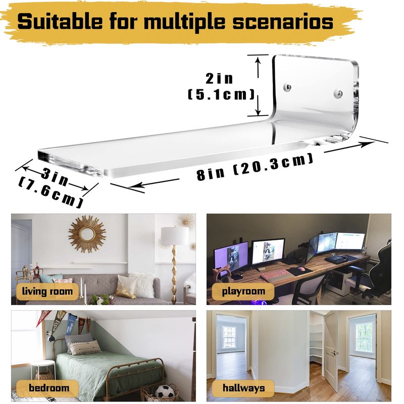 1. The Forzacx floating shoe display shelf is made of 0.23" thick high-quality clear acrylic, and the art-like look complements your decorations.