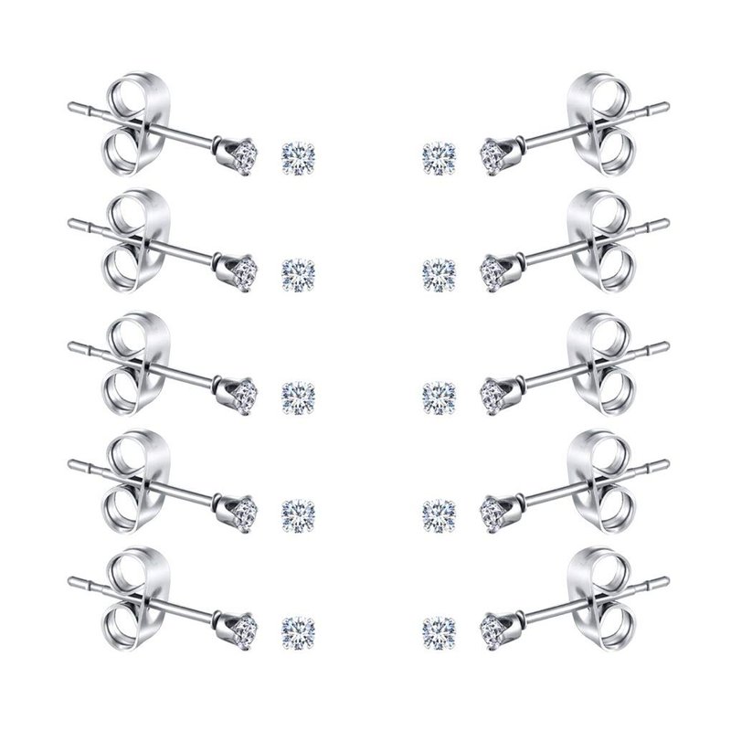 FOSIR 10 Pairs Tiny Women's Stainless Steel Round Clear Cubic Zirconia Stud Earrings (2mm CZ, Surgical Steel)