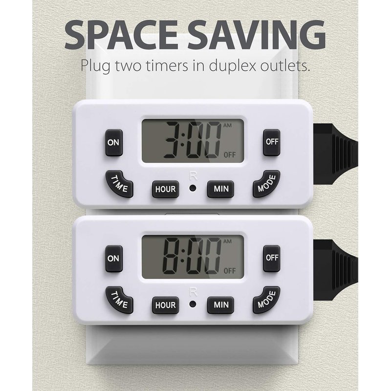 - [SPACE SAVING] The outlet timer only occupies one socket. You are able to use two timers in duplex outlets, or leave the neighboring socket available for other devices. The low profile, side-entry plug design makes the timer fit behind furniture or in other hard-to-reach areas.