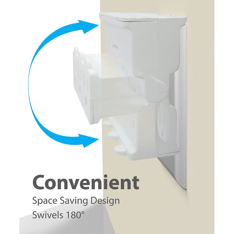 Vertically swivel this outlet adapter up or down to plug cords in facing up, down or to the front depending on preference. The swiveling outlet keeps plugs close to the wall in tight places. The convenient space saving design swivels 180°.