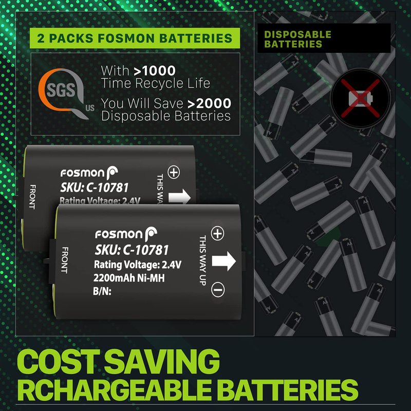 - [COST SAVING RECHARGEABLE BATTERIES] How many disposable batteries have you thrown away? Have you thought of how much money it would save to say goodbye to using AA batteries in your controllers? With Fosmon high capacity 2200mAh rechargeable batteries, you will save hundreds of dollars and thousands of AA batteries. The rechargeable battery is compatible with latest Xbox Series X/S (2020 Version), also backward compatible with Xbox One/One S/X and Elite Controllers.