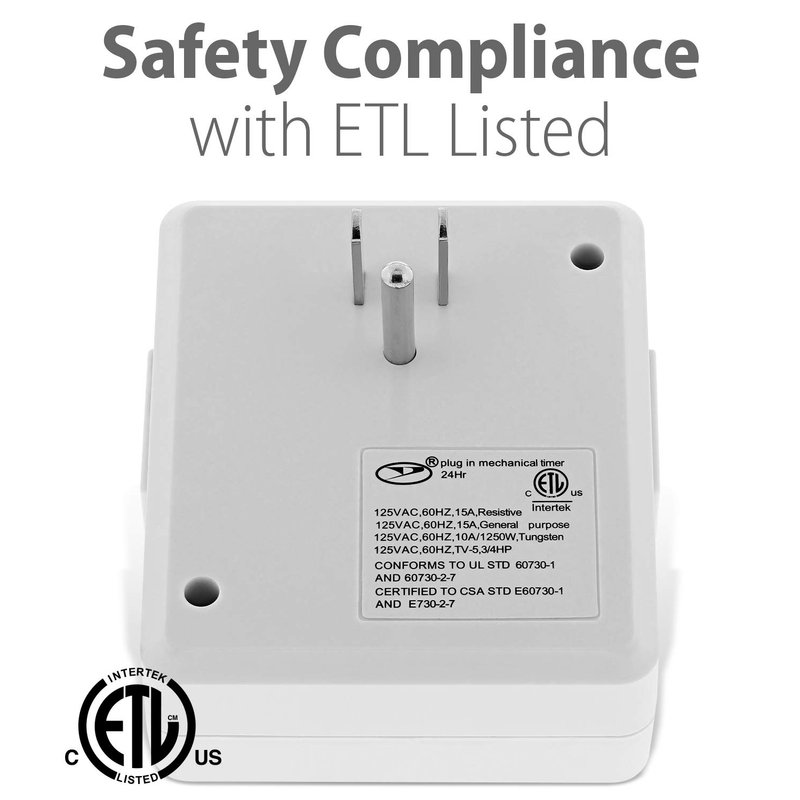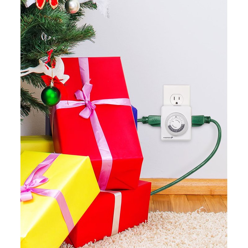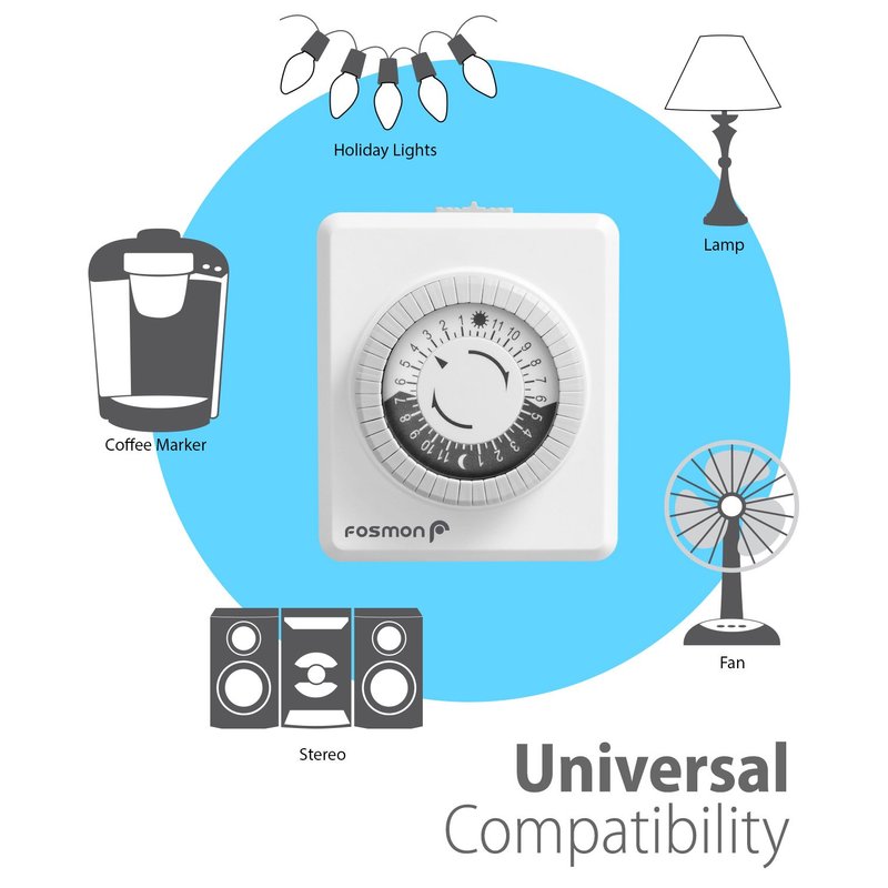 Great for Lighting Conveniently turn your indoor lights on or off automatically anytime with Fosmon's 24-hour mechanical timer. It is ideal for seasonal lights and lamps. Fosmon's timer is also great to help deter crime as it automatically turns your lights on and off. 2 Outlet Design Designed with dual outlets, letting you plug in up to two devices at once. Fully Programmable 24 hour programming in increments of 30 minutes. Easy to operate and programmable with 48 pushpins, up to 24 on/off settings per day - the cycle repeats every 24 hours. A convenient override switch is located on the top for manual uses. Save Energy and Reduce Utility Costs Fosmon's Outlet Timer can help save on energy and reduce utility costs as it can turn your devices on and off automatically. Multiple Uses Great for TVs, lighting, heaters, sprinkler systems, terrariums, aquariums, humidifiers. Limited Lifetime Warranty This Fosmon product includes a limited lifetime warranty. Please visit Fosmon's website for more details. Specifications 110-120v AC Outlets 15amps max 125VAC,60HZ,15A,Resistive 125VAC,60HZ,15A, General purpose 125VAC,60HZ,10A / 1250W,Tungsten 125VAC,60HZ,3/4HP TV-5 ETL Listed Package Includes Outlet Timer x 2