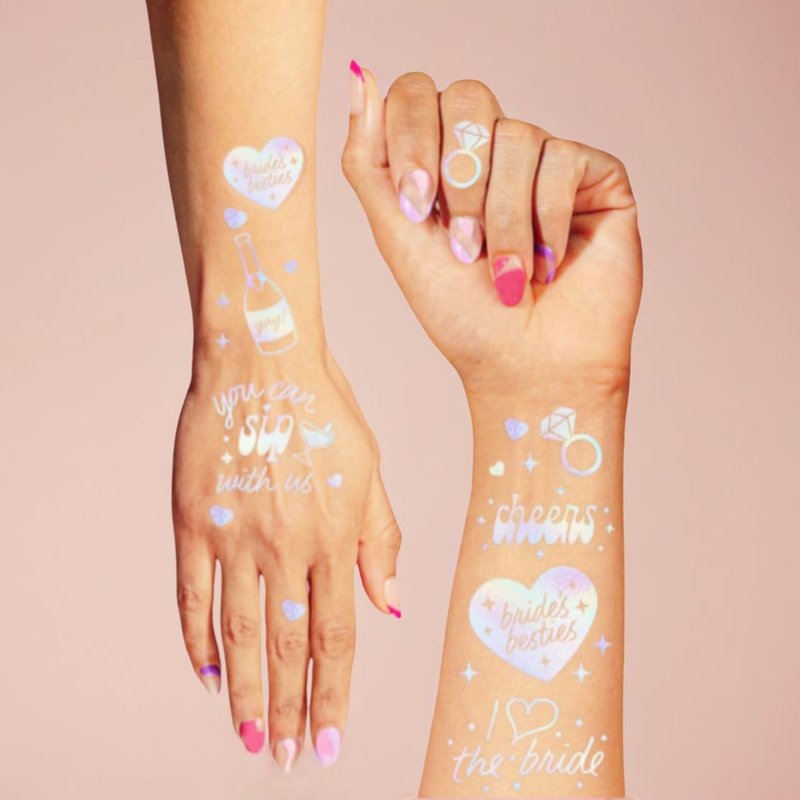 - Stylish and Subtle - The bride sash, a 63 * 3.7 inches of satin charm with white rhinestones, is light at 18g, perfect for a night of dancing. The bridesmaid&bride tattoos, with 2 sheets of 20-pattern waterproof iridescence, suitable for any pool party, adding a touch of shimmer.