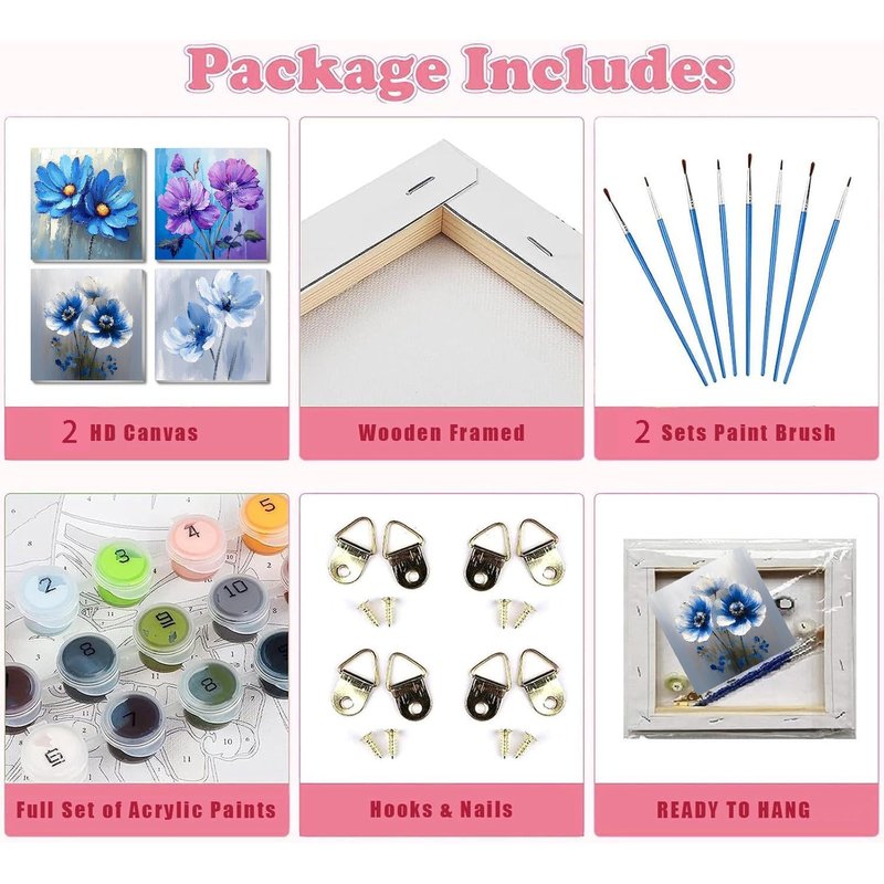 - 【WHAT YOU GET】 Acrylic adult paint by number kits with frame has 4 complete tool kits, including 8 brushes, 4 matched paint and 4 set hook nails. Open the package and you can start painting immediately.