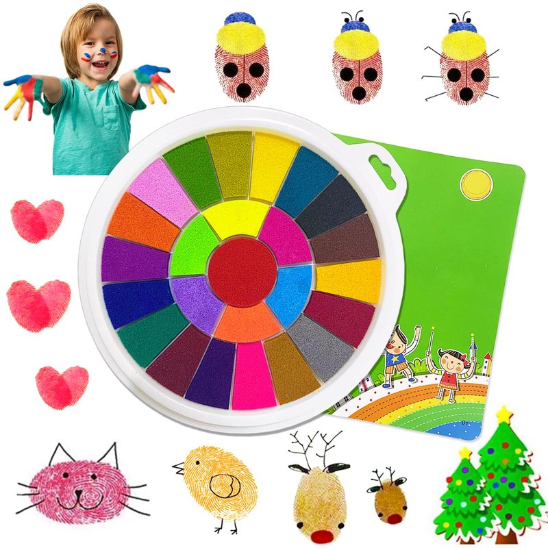 - Package include:A finger painting kit contains a disc ink pad in 25 different colors and an exquisite picture album.There are various patterns in the picture album,and children can use their fingers to create and paint on the picture album.The rich colors make the paintings colorful and beautiful