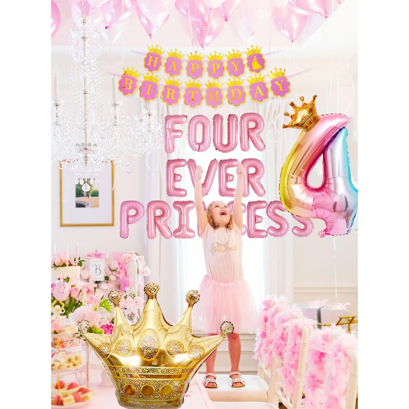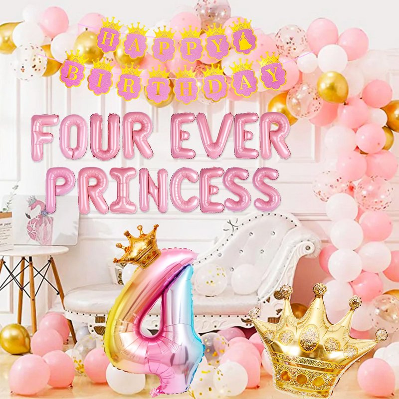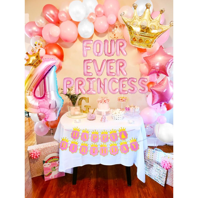 - 4th Birthday Princess Balloon: Princess birthday party decorations include 1 large 32 inch number 4 balloon, 1 16inch Four Ever a Princess letter balloons, 6 pink balloons, 6 white balloons, 6 gld foil balloons, 1 princess happy birthday banner, and 1 large 30inch crown balloon for a total of 50 pieces