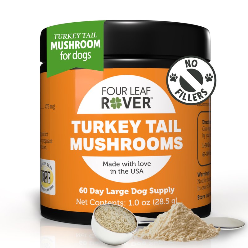 Four Leaf Rover's premium dog supplements include a meticulously crafted mushroom supplement designed to fortify your canine companion's immune system. Turkey Tail Mushroom for dogs is renowned for its potent health benefits, making it an essential addition to your pet's wellness routine. Four Leaf Rover is committed to delivering the highest quality dog supplements. Our mushroom supplement is organic, ensuring that your pet receives only the purest ingredients. Each serving is high in beta-glucans, the active compounds responsible for the immune-supporting properties of mushrooms. This powerful ingredient supports your dog's immune function, promoting overall health and well-being. To guarantee efficacy and safety, our dog mushroom supplements undergo rigorous 3rd party testing. This step ensures that every batch meets our stringent quality standards. Additionally, our product is double extracted, a process that maximizes the bioavailability of beneficial compounds, ensuring your dog reaps the full benefits of these potent mushrooms. Unlike many other products on the market, Four Leaf Rover's mushroom supplements are made from whole mushrooms. This approach preserves the integrity and potency of the natural ingredients, providing a superior product that stands out in the crowded field of dog supplements. We are proud to say that our supplements contain no grains or fillers, offering a pure and potent formula that focuses solely on delivering health benefits. Choose Four Leaf Rover for a reliable, effective, and organic mushroom supplement. Invest in your dog's health today and see the difference that high-quality, carefully crafted dog supplements can make. Your pet deserves the best, and with our Turkey Tail Mushroom for dogs, you can provide them with unparalleled immune support and overall wellness.