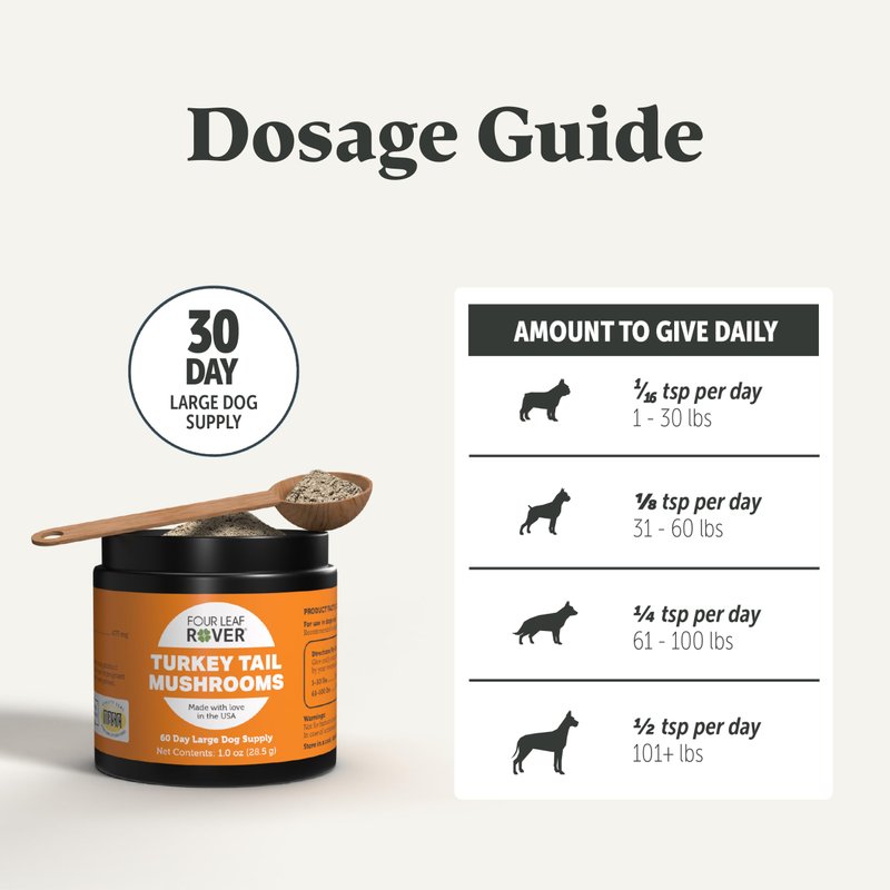 Four Leaf Rover Turkey Tail Mushroom for Dogs - Whole, Organic Mushrooms - Tested High in Critical Beta-Glucans - No Grains or Fillers - 60 Day Large Dog Supply