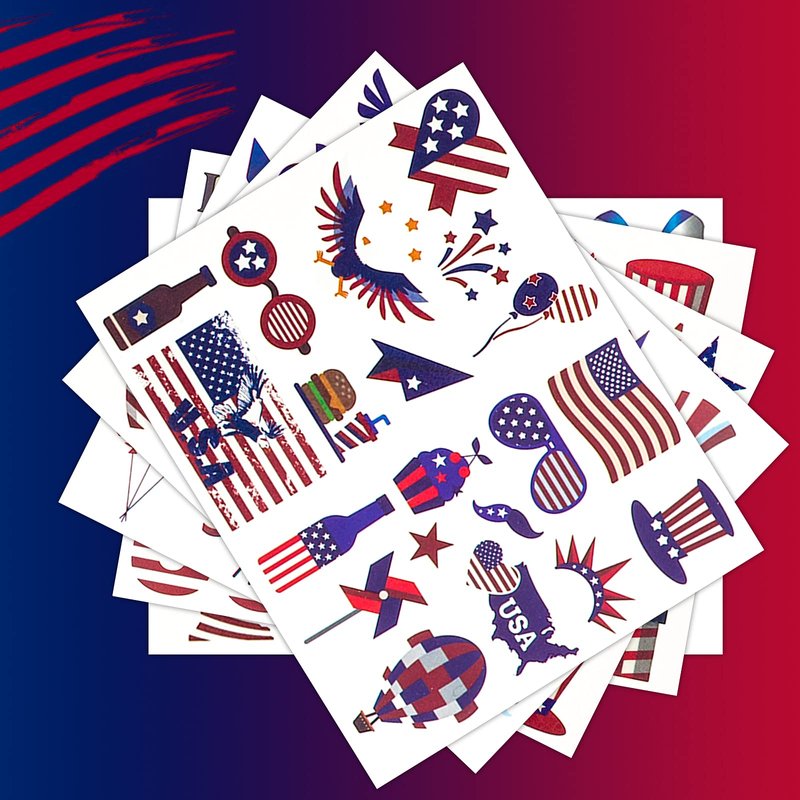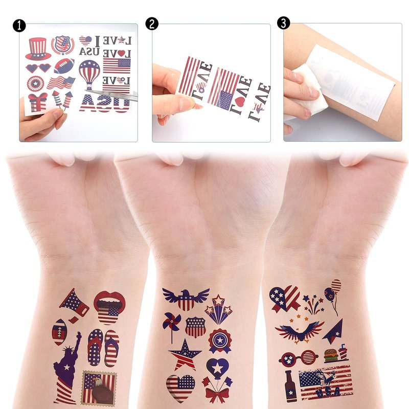 - Waterproof&Long-lasting -- Fourth of July Tattoos last for 2-3 days and are waterproof. The USA temporary tattoo itself is non-toxic and safe. The America tattoos will not hurt the skin. Perfect for face, body, cheek,arm, hand ,ankle or anywhere you want a touch of glamour!