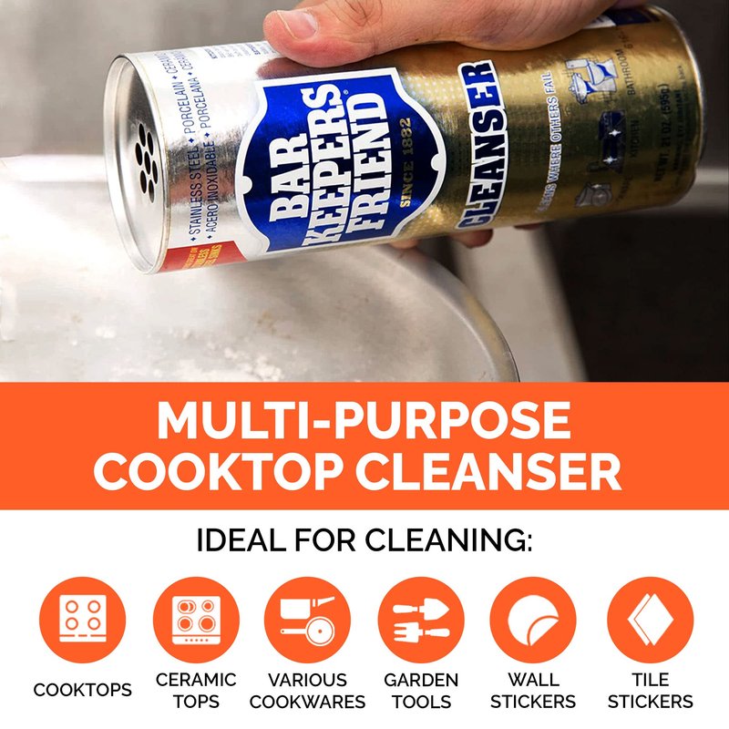 - Tough on Stains, Easy on Surfaces – Give your cooktop and other parts of your home a fresh reset with this cookware cleaner bundle. Retaining its original 1882 formula, bar keepers friend cleanser polish is safe and effective in cleaning nonporous surfaces.