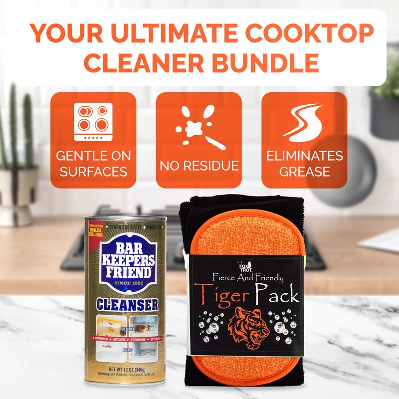 - Your Ultimate Cooktop Cleaner Bundle – Fed up with stubborn food residue on your ceramic cooktop? Safely and easily clean it with our complete cleaning set, which includes barkeeper's friend Powder Cleanser and Fox Trot’s microfiber towel and dual-sided sponge.
