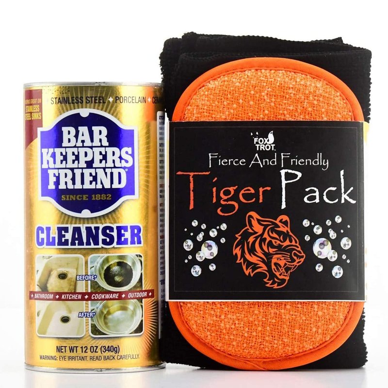 Fox Trot Bar Keepers Friend Powder Cleanser, 12oz Multipurpose Barkeepers Friend Cleaners, Stainless Steel Cleaner Tiger Pack, Black Pro-Grade Microfiber Towel & Dual-Sided Sponge, Bartenders Friend