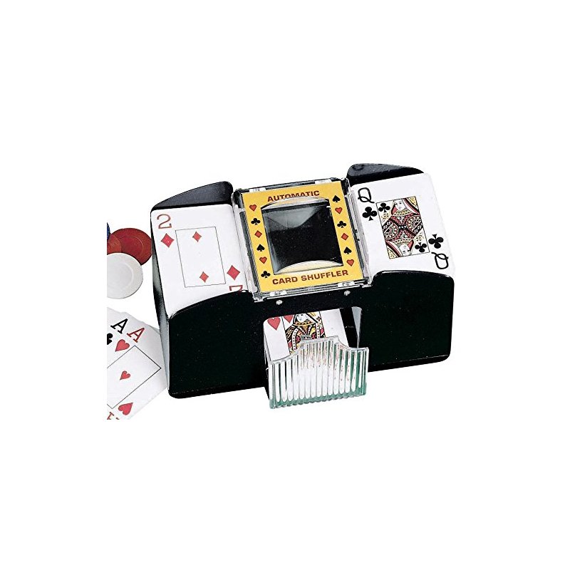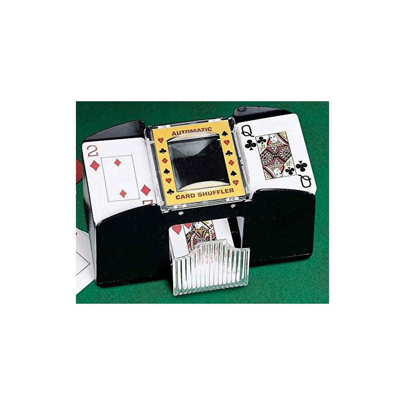 Automatic card shuffler shuffles decks in seconds. Just place cards in side trays, push button, and rollers shuffle cards through to the center. 2-Deck requires 4 AA batteries, 4-Deck requires 4 C batteries (not included). Both measure 8" L x 3 3/4" W.
