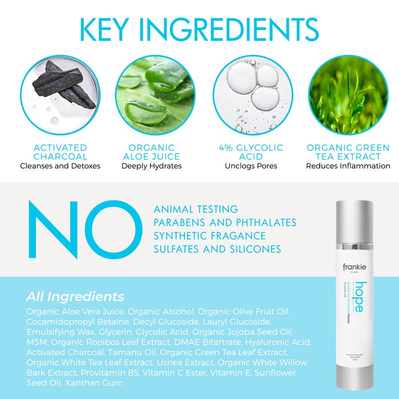 - 4% Glycolic Acid Face Wash: HOPE is a gentle sulfate free acne face wash that gently exfoliates and removes pore clogging dirt with 4% glycolic acid and activated charcoal