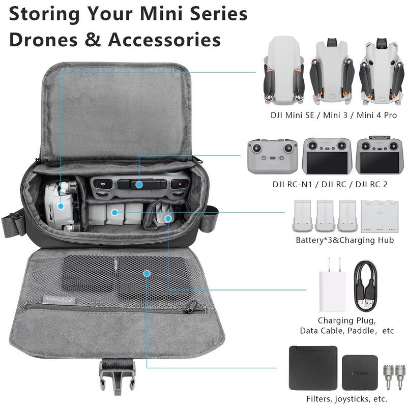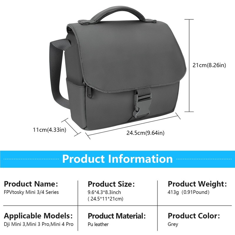 FPVtosky Shoulder Bag for DJI Mini 4 Pro / Mini 3 Pro Drone , Mini 3/4 Series Travel Carrying Bag for DJI Mini 3 Pro / Mini 4 Pro Case , Premium DJI Mavic 3 / 4 Series Accessories Specifications: Main Material:PU Color:Grey Product Size:24.5 * 11 * 21 cm(9.6 *4.3 * 8.3 inch) Product Weight:413 g (0.91 lb) Features: 1. The interior features a magic buckle partition, effortlessly separating the main accessories of the drone, preventing them from scratching each other. The partition can be adjusted according to needs, providing temporary storage for additional items such as cameras, other travel essentials, etc. Additionally, there are two side pockets, a front pocket, a back zipper pocket, and a top mesh pocket. Despite its compact size, it offers substantial capacity, easily accommodating all your accessories and keeping them neatly organized. 2. The surface is made of high-quality PU leather, which is waterproof, easy to clean, and wear-resistant. The shoulder pads and handles are designed with breathable materials for added comfort during use. The interior partitions are made of suede soft boards, complemented by suede lining, providing a comfortable touch and better protection for the DJI Mini drone and Drone accessories. 3. The DJI Mini 4 series travel bag offers versatile usage options including hand-carrying, single-shoulder carrying, and cross-body carrying to accommodate various scenarios. This bag features buckles that can be easily operated with one hand, allowing convenient access to drone accessories during flights. The zippers of the DJI Mini 4 series travel bag are also remarkably smooth, ensuring effortless opening without encountering any resistance.