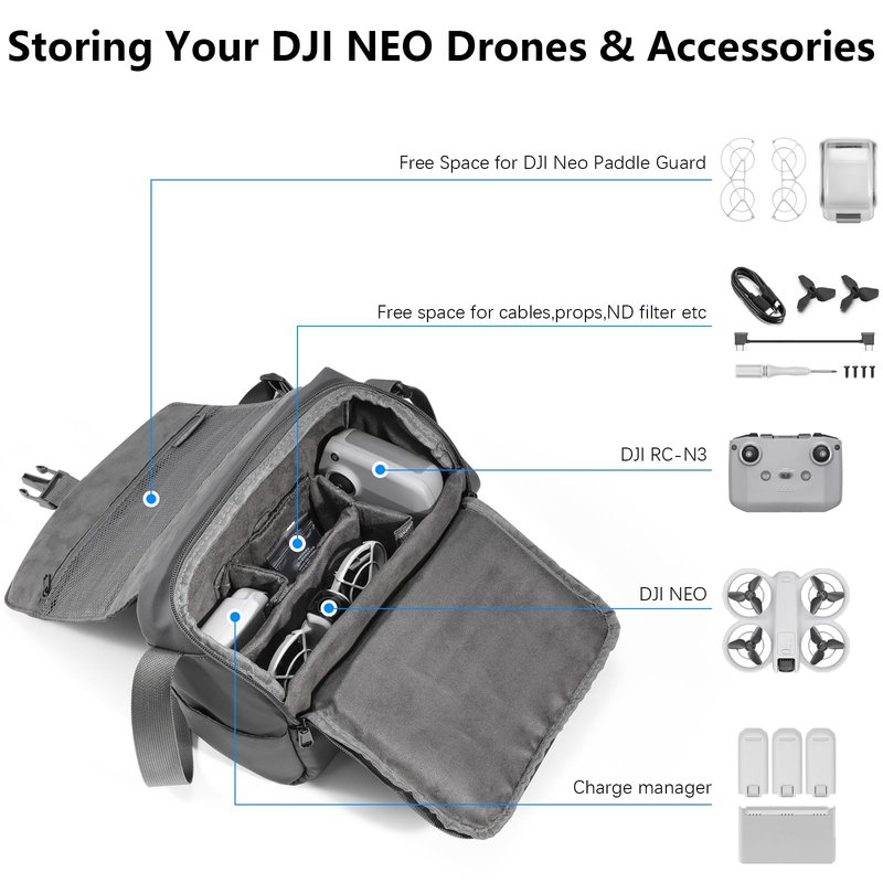 - 【Professional Design】This DJI NEO/ mini 4 pro / DJI Mini 3 Pro carrying Bag is specially designed for DJI NEO/ DJI Mini 4 Pro / DJI Mini 3 Pro Drone and accessories. The shoulder bag can hold DJI/NEO DJI Mini 4 Pro or DJI Mini 3 Pro Drone、DJI RC or DJI RC 2 controller or standard remote without screen、Battery、Charging Hub、ND filters、propellers、Lanyard、controller Sun hood Cover other data cables and accessories, etc, which giving you the most reasonable storage space.