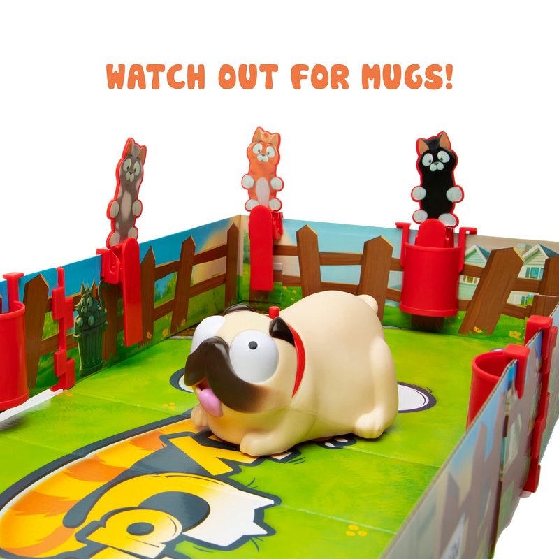 - FUR-FLYING FUN: Get your cat ready, if Mugs catches you, you'll go flying—Boing—and you'll be sent back to the start!