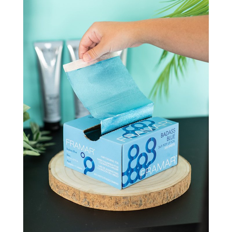 The Framar Limited Edition Blue pop up foils will bring fun and excitement to your daily highlights behind the chair! Not only do the look sexy, but the embossed texture helps grip to the hair, ensuring that they will not slip! These foils also do not make much noise when being used, in comparison to that flimsy noise you hear with other cheaper foils that may annoy your clients. They’re more resistant, stronger, and do not tear easily like other thin foils. The Framar Blue Foils conveniently pop up from the box without sticking or tearing, allowing you to go from the box directly to the hair! These foils are made specifically for the professional hair colorist, coming in 5x11 pre cut dimensions and a pre folded edge built into it, allowing you to immediately place your foiling comb underneath!