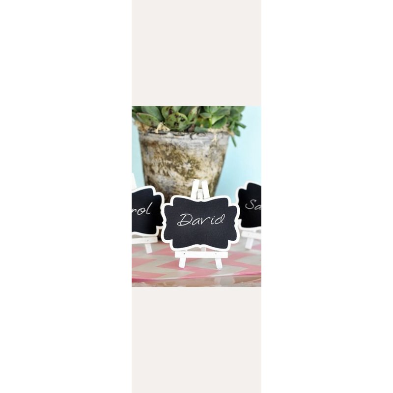 Having a hard time trying to label your seating chart in a way that informs your guests without interfering with your party theme? Well, you're in luck! These Mini Chalkboard Place Cards are perfect for any occasion and any theme. With an elegant white vintage frame and matching easel, these mini place cards add the perfect touch of classy elegance, without interrupting your color palette! Size: 2.75" x 3.25" Idea: Use chalkboard "markers" for easier writing (available at your local art store).