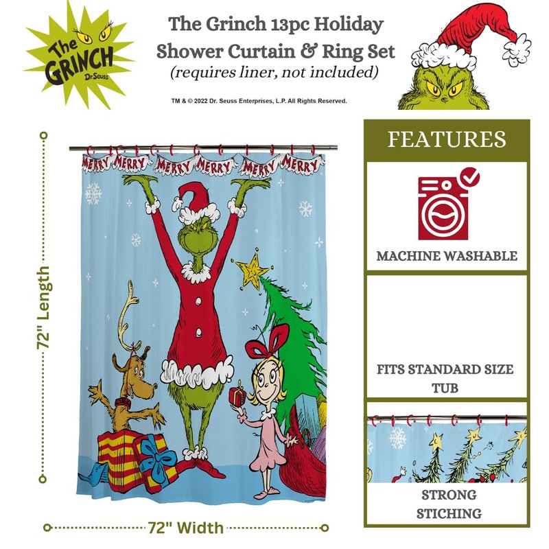 Franco Dr. Seuss The Grinch Holiday 13 Piece Shower Curtain and Ring Set, (100% Officially Licensed Product)