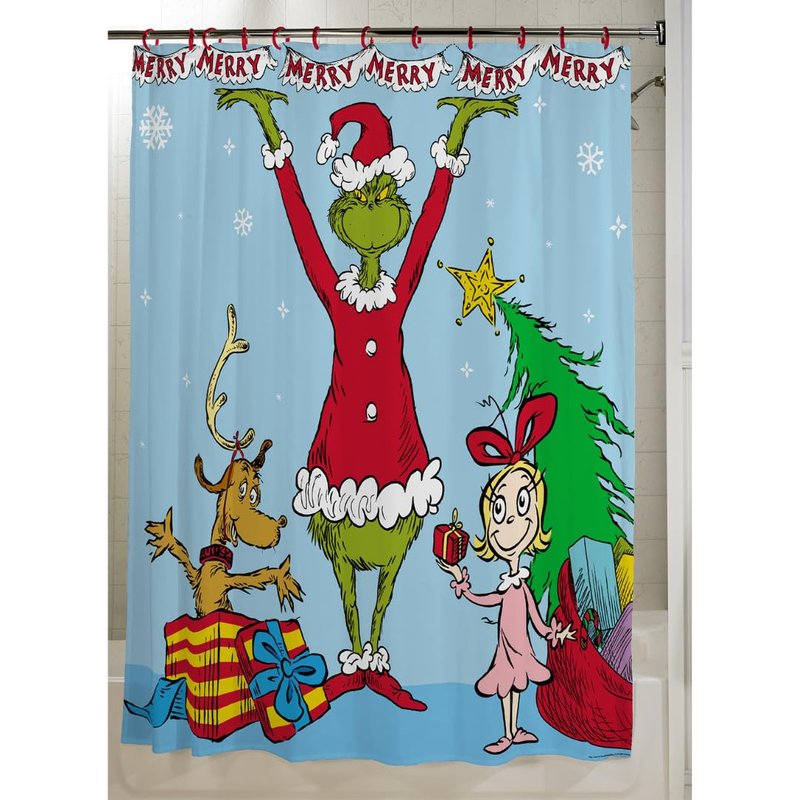 - THE GRINCH DESIGN: Join the Grinch and Max on a sleigh ride down the hill, delivering a sack of presents to Whoville on this whimsical shower curtain. Transform your bathroom into a magical holiday escape.