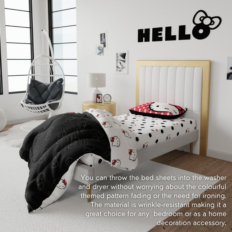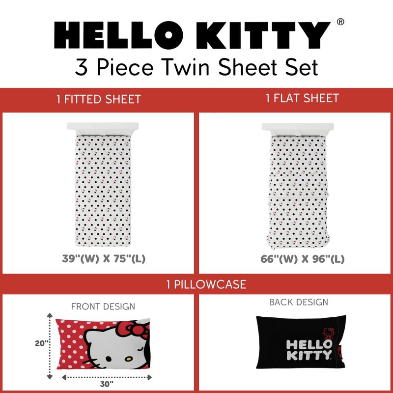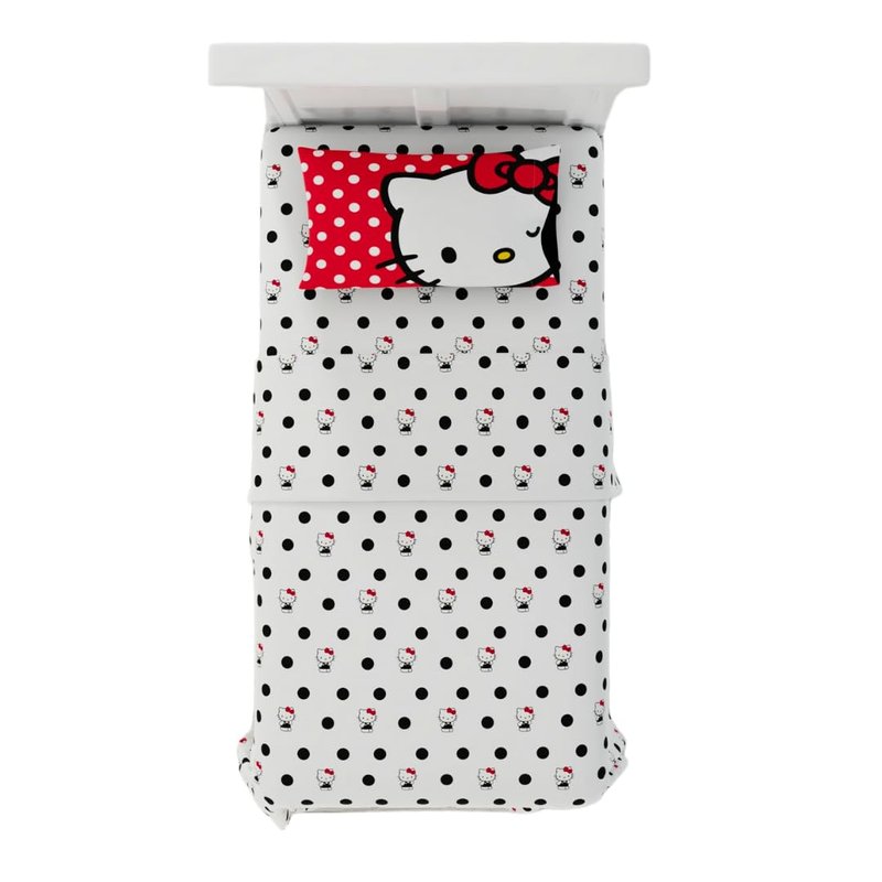 - HELLO KITTY DESIGN: Join in on the fun with a polka dot party featuring everyone's favorite feline, Hello Kitty. This sheet set pops with polka dots and the iconic Hello Kitty character from Sanrio.