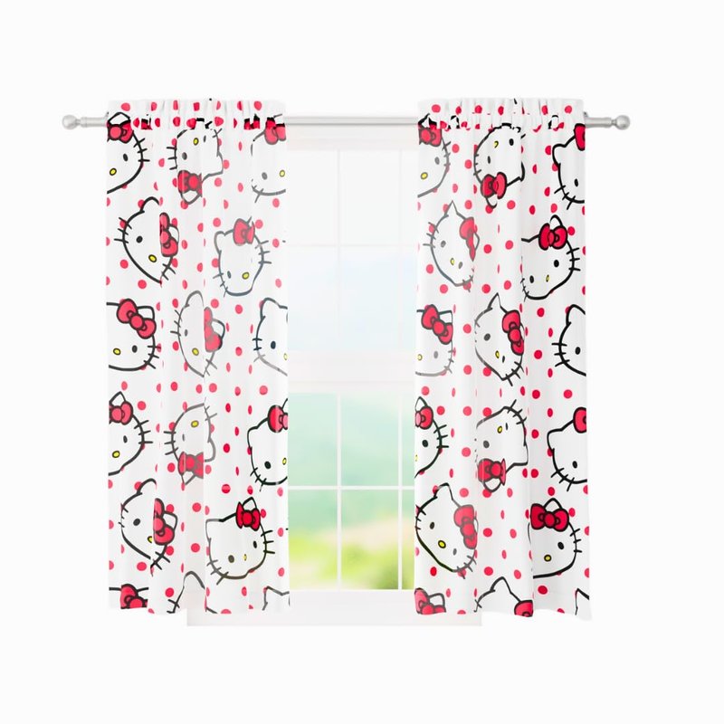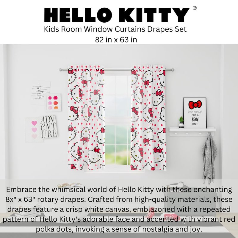 - HELLO KITTY DESIGN: Hello Kitty 8x" x 63" rotary drapes exude charm with a white backdrop, adorned by Hello Kitty's endearing face print and playful red polka dots. Nostalgic and delightful, perfect for any space.