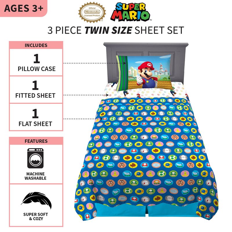 - SUPER MARIO DESIGN: Give your gamer’s bedroom a Super new look with this cool and comfy Super Mario sheet set. The dynamic "The More the Mario" pattern features vibrant colors and brothers Mario and Luigi from the iconic Nintendo video game