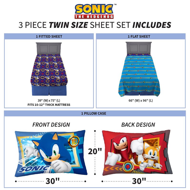 - SONIC THE HEDGEHOG DESIGN (PRINTS MAY VARY!): Power up his bedtime comfort with this cool and colorful Sonic sheet set. Sonic the Hedgehog and his pals Knuckles and Tails collect rings with supersonic speed on this eye-catching "Sonic On The Move" themed set.