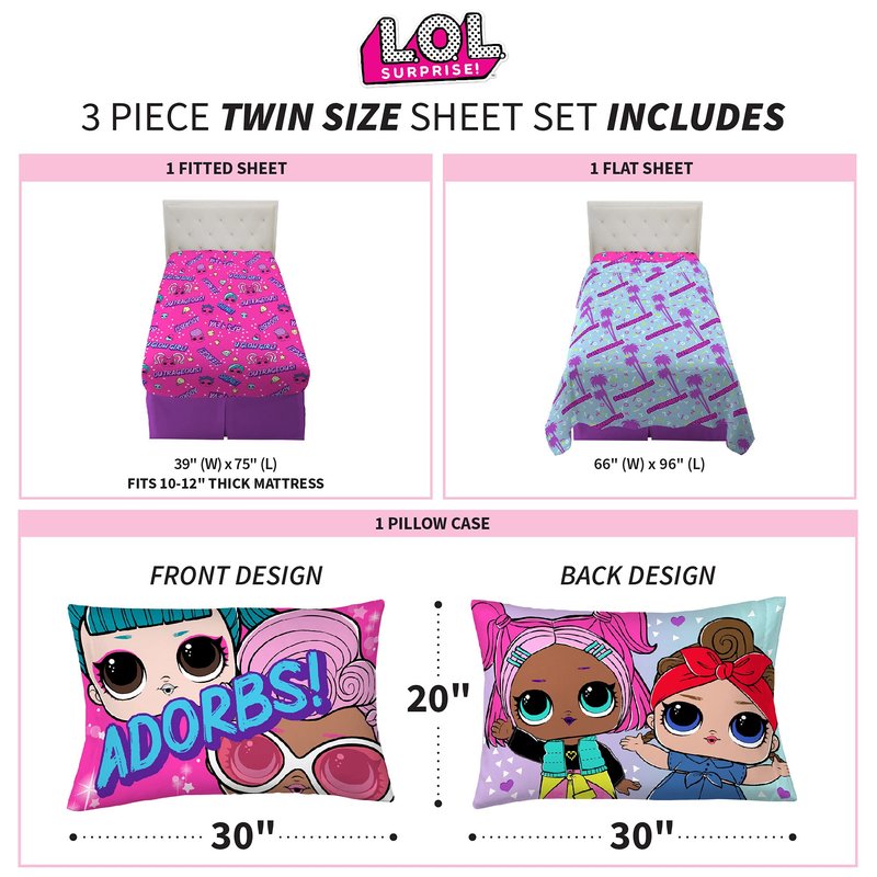 - FUN AND COLORFUL: Vibrant shades of pink, blue and purple pop on the "Outrageous" pattern of this cool and colorful LOL Surprise sheet set. Adorable character imagery adds a fun and fashionable look that young girls are sure to love.