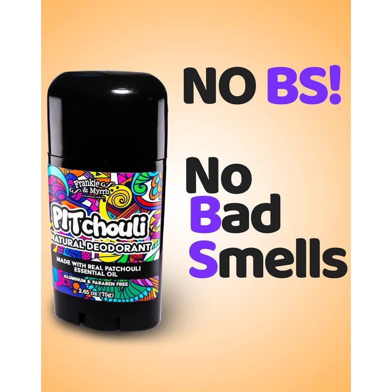 PACK OF 2! This deodorant is NO BS! No Bad Smells! The ultimate patchouli deodorant is here! Aluminum free, baking soda based and pure essential oil scented deodorant is made just for you. Specifically formulated to feel fresh and smell great while delivering superior protection against odor without any nasty chemicals. In addition this scent is specifically formulated to relieve irritability and stress with aromatherapy benefits