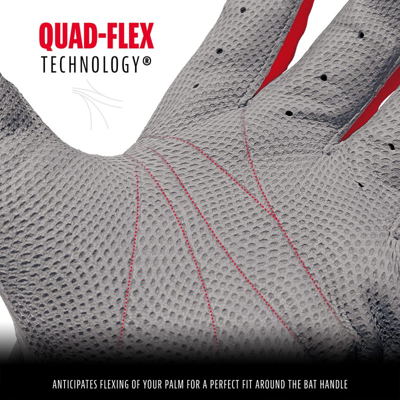 - QUAD-FLEX TECHNOLOGY: Anticipates flexing of your palm for a perfect fit around the bat handle