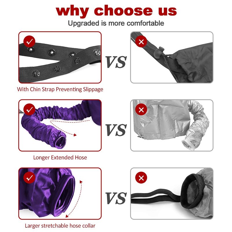 - 【Adjustable Hood Capacity】The adjustable side-located drawstring and the chin strap to ensure the hair drying bonnet does not come off during use, allows you to adjust the fit around your head size, hairstyle, hair accessories.