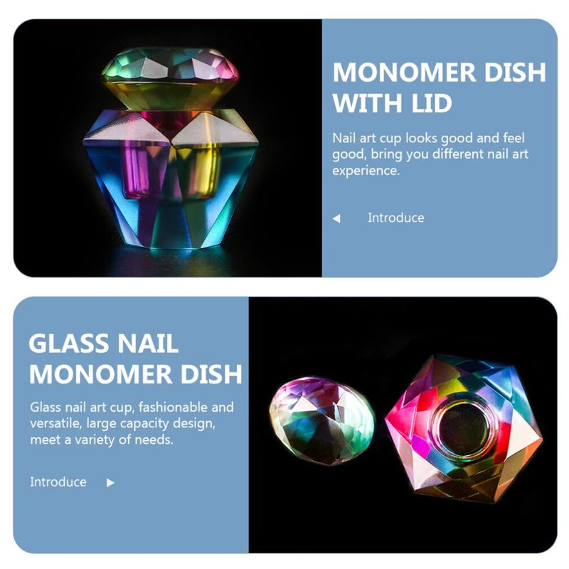 - Glass monomer dish with lid: unique shape design for holding, can be used for mixing acrylic nail liquid, cleaning nail art pens, etc