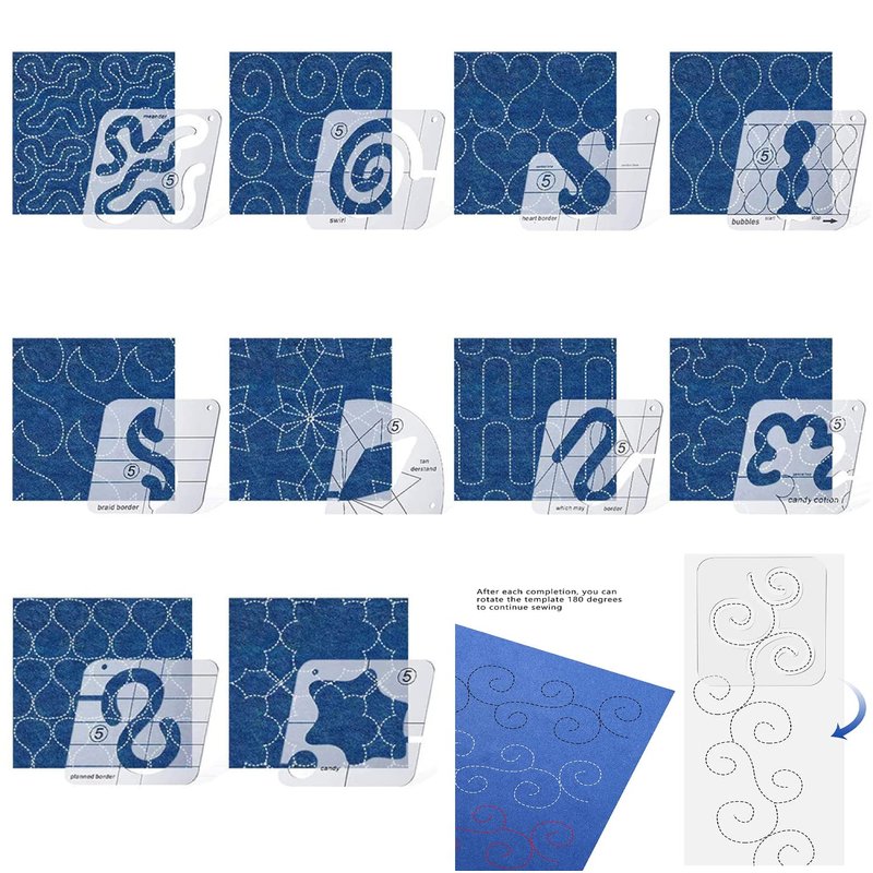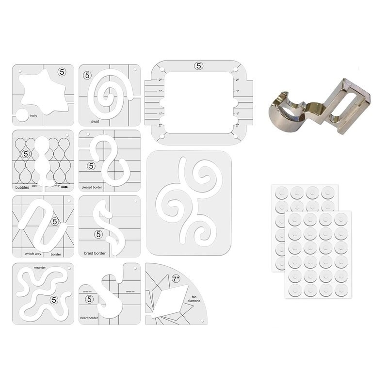 - This set contains 11 different types of flexible motion quilting templates with 3mm thickness(strong ,not easy break), low shank ruler foot with 48 pcs non-slip grips for quilt templates. They are designed for quilting meander and stipple patterns on quilts or other textiles, different styles provide multiple choices for these quilting projects.