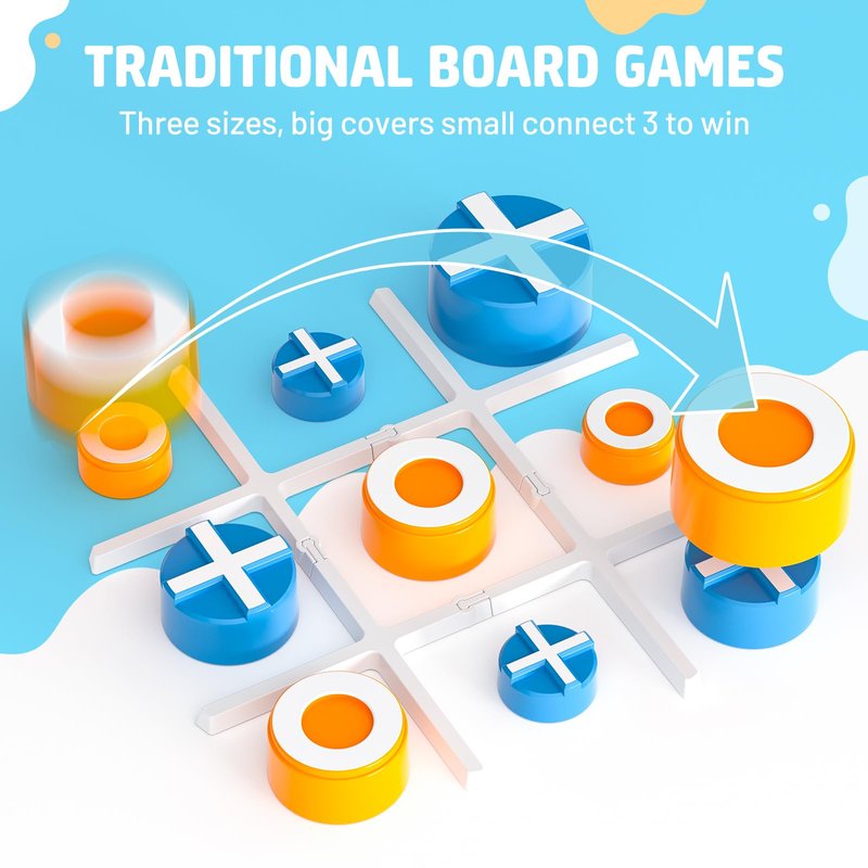 - FUN COVER-UP PUZZLE TIC- TAC- TOE GAME: Game props come with the game box; Both players have 6 pieces in 3 sizes, small, medium and large; Large pieces can cover small pieces, and 3 of the same color in a line win; This exciting board game is great for exercising critical thinking and reasoning skills
