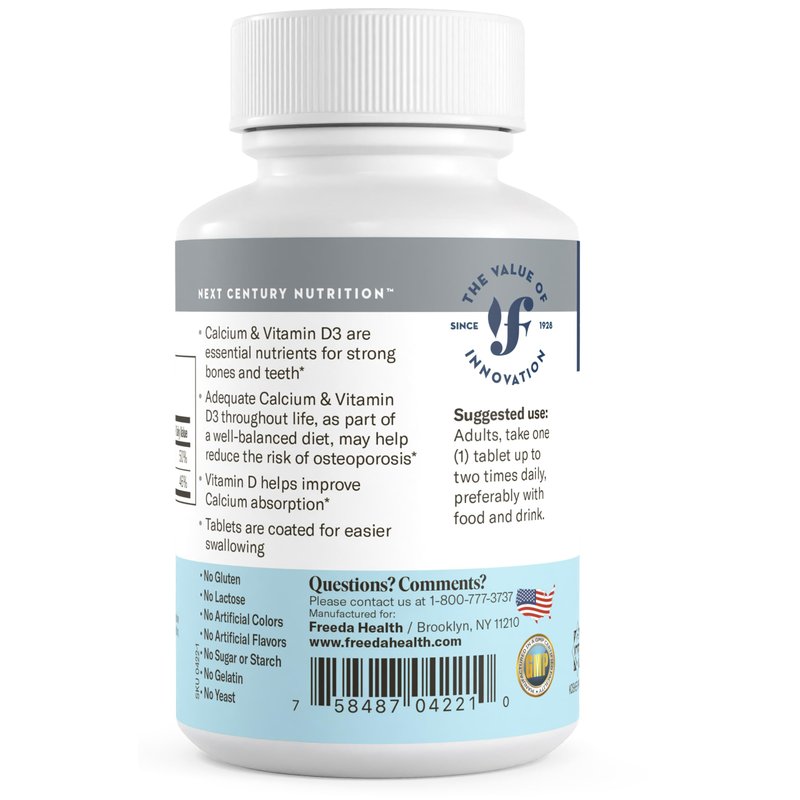 - Made in the USA - Every bottle of Freeda’s Calcium + Vitamin D3 supplement is proudly made in a GMP-certified facility in the USA. Our manufacturing process follows rigorous safety and purity standards to ensure consistency, potency, and effectiveness. We prioritize quality so you can confidently support your bone health with a trusted brand that has been serving the community since 1928.*