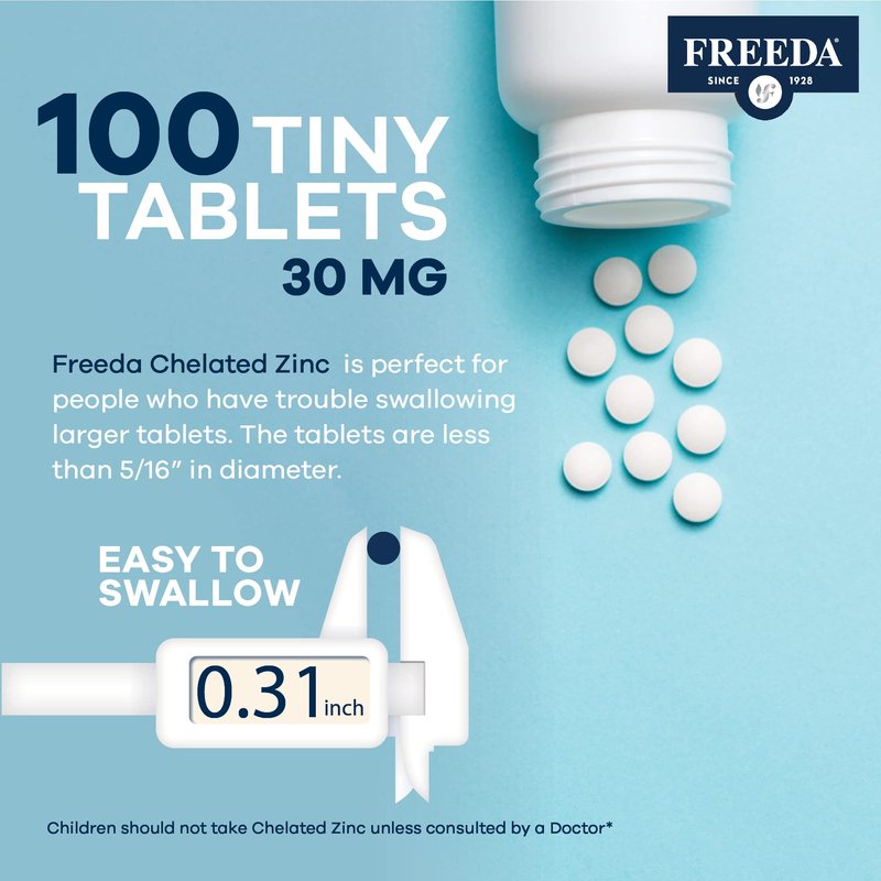 - CHELATED ZINC 30MG - 30 mg zinc chelate in tiny easy-to-swallow zinc tablets as an alternative to standard zinc capsules, zinc pills, or zinc liquid drops. Freeda's zinc glycinate chelate mineral form is easier for the body to absorb than other forms of zinc.