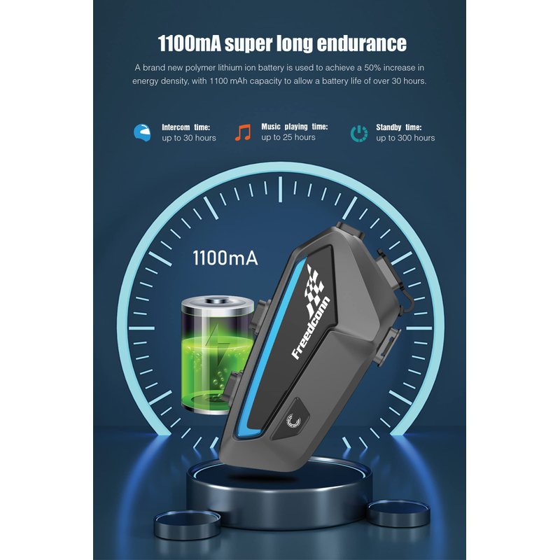 - 【Super Long Standby & IP67 Waterproof】①The motorcycle communication Bluetooth headsets built-in 1100mAh high-capacity battery, the continuous talking time up to 30 hours, the music playing time up to 25 hours, and the standby time up to 300 hours. The helmet Bluetooth intercom with type C charging port, it can be fully charged in as little as 2 hours. ②The main body of the FX communication systems for motorcycle helmets is IP67 standard waterproof level, so don’t worry about sudden rain while driving.