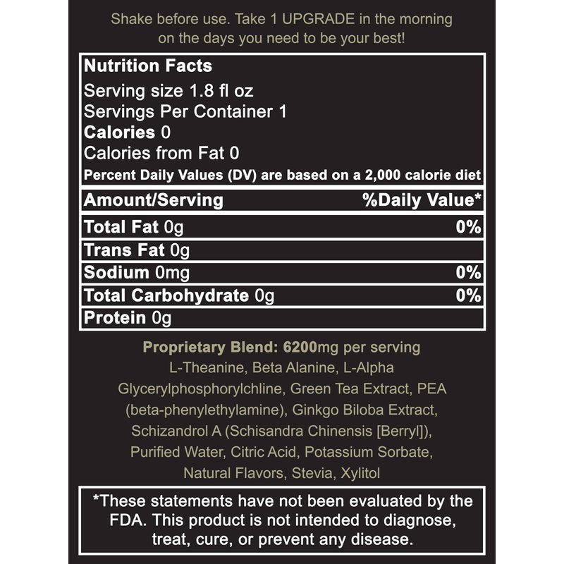- Each 1.8 FL oz bottle contains a serving which makes for an easy and convenient dose of energy boosting supplements for that focus factor. Upgrade boosts Cerebral Circulation. Directing the flow of blood to the most effective parts of your brain, increasing oxygenation, delivery of nutrients, & removal of toxins. Upgrade protects your brain from the everyday stressors that are reducing your brain capacity. Fight brain fog and ageing with Upgrade!