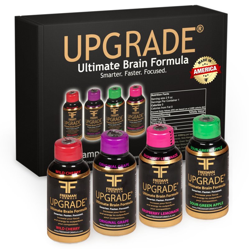 Try all the flavors of our brain boosting super drink. Upgrade is a brain formula that creates long-lasting, non-jitter, no-adrenal stimulant energy, incredible mental clarity, and sustained focus. Every bottle of Upgrade was formulated to work with your body rather than against it. Other energy products down-regulate the adrenal function, creating adrenal fatigue which results in low energy, weight gain, exhaustion, insomnia, dulled senses, and sluggishness. Upgrade helps you be the best you. In the bottle you will find mental clarity, boosted memory & concentration, and the energy to get it done. Regardless of if you are a businessman, teacher, gamer, athlete, engineer, or etc. Freeman Formula Upgrade will upgrade your system!