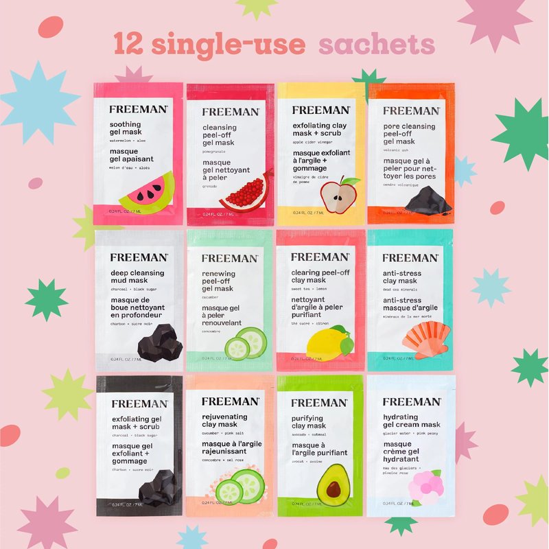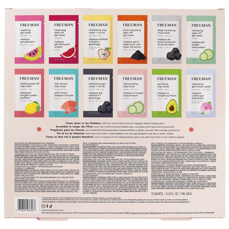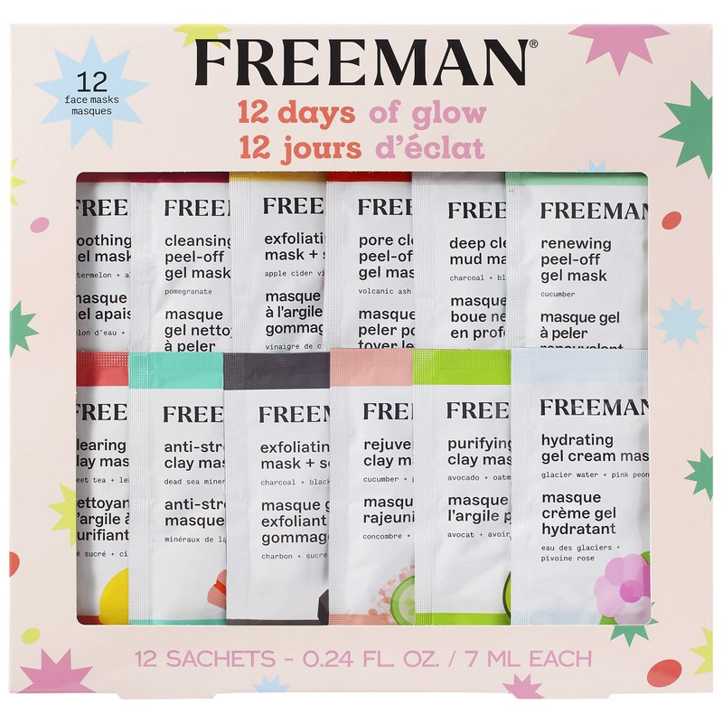 - The Freeman 12 Days of Glow Facial Mask Set includes: (1) Soothing Gel Mask, (1) Cleansing Peel Off Gel Mask, (1) Exfoliating Clay Mask and Scrub, (1) Pore Cleansing Peel Off Gel Mask, (1) Deep Cleansing Mud Mask, (1) Renewing Peel Off Gel Mask, (1) Clearing Peel Off Clay Mask, (1) Anti-Stress Clay Mask, (1) Exfoliating Gel Mask and Scrub, (1) Rejuvenating Clay Mask, (1) Purifying Clay Mask, and (1) Hydrating Gel Cream Mask