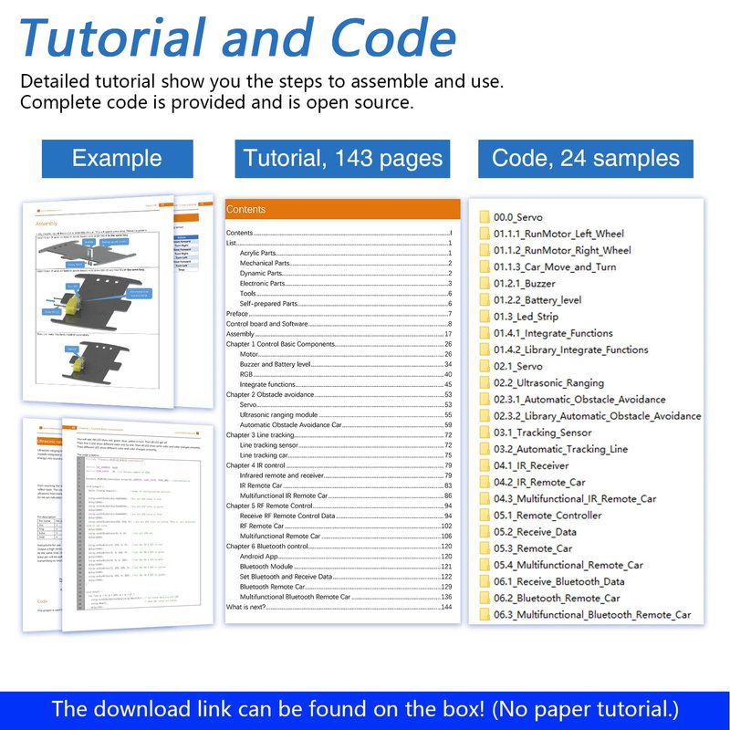 - Provides detailed assembly tutorial and complete code -> The download link can be found on the product box. (No paper tutorial.)